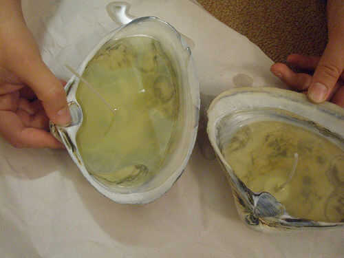 Sobre una superficie protegida, vierta con cuidado la cera en las cáscaras. Ayuda si tienes la cera líquida en una taza con pico para dirigir mejor la colada. Lo tuve en una taza y derramaba mucho. Este paso ayuda a tener un amigo Sujete firmemente las cáscaras o queden circule en algo ya que las bases no son totalmente planas.