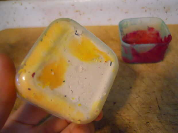 En primer lugar, vas a querer hacer una base para la vela para formar en y también para evitar que se pegue al envase de plástico. Puede hacer esto tomando dos crayones blancos y los de fusión en el recipiente de plástico "que formando" como se muestra a continuación. Para fundir las ceras, poner el recipiente en la olla de cocción, que debe estar llena de agua hirviendo.