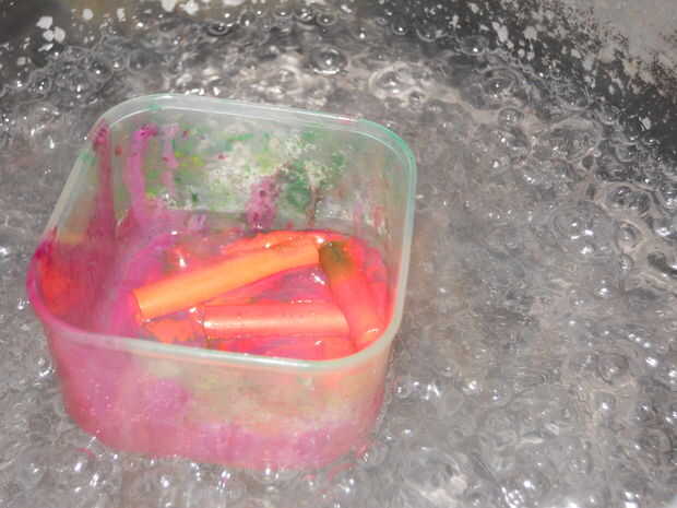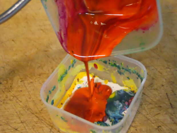 a continuación, tome al menos dos lápices de colores (preferiblemente deben ser colores algo similares) y fundir en el segundo envase (esto puede dejarse en el agua hirviendo hasta que se derritan). Una vez que está derretidos totalmente, tire el segundo envase del agua hirviendo con las tenazas para cocinar y vierta las ceras fundidas en el envase "formar".