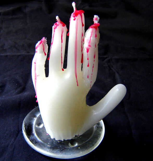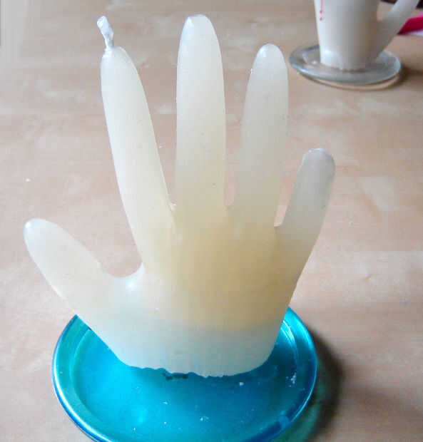 Funcioné a través de un tutorial sobre cómo hacer una vela sumergiendo un globo inflado en cera. Me tiene preguntándome si yo podía hacer lo mismo con un guante de látex. Lo de la vela del globo es que no tiene una mecha, usted sólo tiene que colocar una candelita dentro de la cáscara de cera. No me gustó que, deseaba que mi vela mano tener mechas con los dedos. Así que en lugar de sumergir el guante en cera, vierte cera en el interior con mechas por los dedos. Para hacer la vela de mi mano más macabro para Halloween he añadido algunos cera roja para que se vea como son sangrado los dedos.