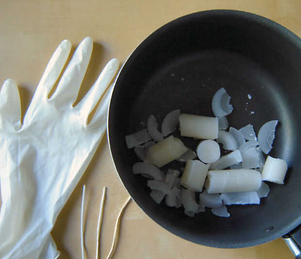 * Una nota sobre los guantes: trabajo en un laboratorio para tener acceso a varios tipos y tamaños de guantes. Los guantes utiliza soportaron el calor de la cera, pero encontré que unos guantes más finos parecen rasgar un poco alrededor de la mecha y empezó a gotear, logró la fuga la abrazadera cierre con algunos clips de la carpeta es todavía salvable. Los encontré trabajado mejor eran Softub látex guantes de examen sin polvo. Nosotros también guantes de nitrilo en nuestro laboratorio, pero no he probado los todavía.