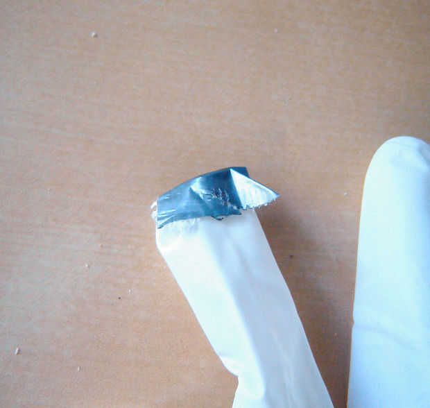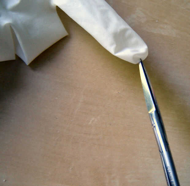 • Hágale un agujero pequeño en la punta de cada dedo que desea tener una mecha de la vela.