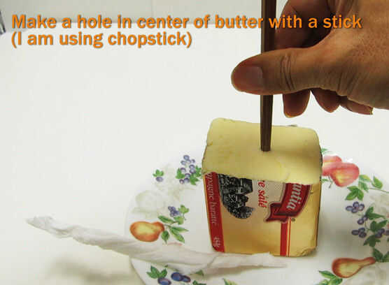 vela de mantequilla casera que toma menos de 5 minutos para hacer!Paso 1: Conseguir la materia Botón de mantequillaPalillo de dientesHoja de papel higiénicoEncendedorToalla de papelPaso 2: Hacer una mecha Obtener el papel higiénico y partirla en cuat