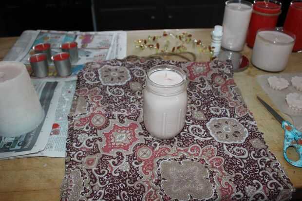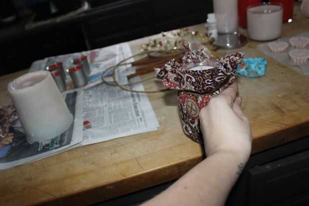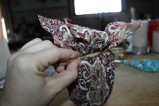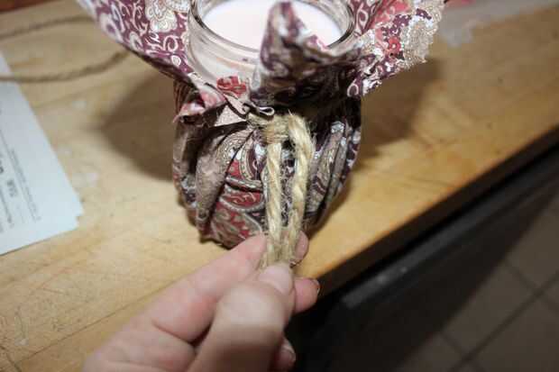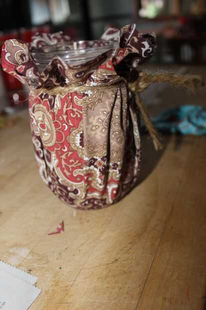 Usar retazo al abrigo de uno de mis velas. Me corte en una plaza y llevarlo hacia arriba y alrededor de la jarra. Añadir hilo para atar en la parte superior de la jarra. Luego tire en la tela de la parte superior hasta incluso todo el camino alrededor. Después de amarre el hilo en un nudo más fuerte.
