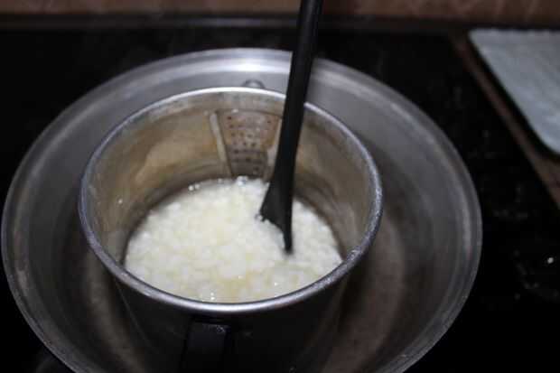 Derretir los chips de soya y revuelva hasta que los copos han derretido. La temperatura debe ser entre 120-140 grados