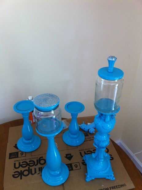 Después de que dejas el Portavelas y las tapas secos. Polvo ligeramente las áreas que desea bedazzled con adhesivo en aerosol. He utilizado glitter Plata! Este pegamento de aerosol desordenado por lo que le llevo a causa de guantes es STICKY! Yo sólo diablo con el diablo los párpados y el tornillo de la lámpara. Utilicé una pistola de pegamento caliente para adherir el tornillo de la lámpara y frascos para los pilares. Tipo de puede ver el pliegue de la cola alrededor de la base de la jarra. Easy fix es una cinta, caliente puede pegar una cinta para ir alrededor de la base para ocultar el sello. Estoy usando una cinta de plata brillante!