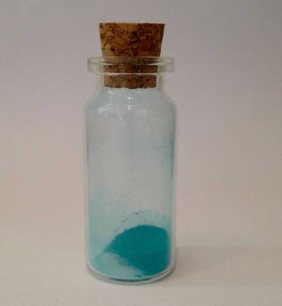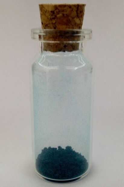 Como los cristales con que me quedé algo pequeños me los puse en un frasco de vidrio pequeño como estaban. Para el uso como pigmento desea moler en un polvo pero prefiero mantenerlo como pequeños cristales ya que es menos sucio si lo derrama. Los cristales son fáciles de moler en un polvo que es un azul más ligero de los cristales.