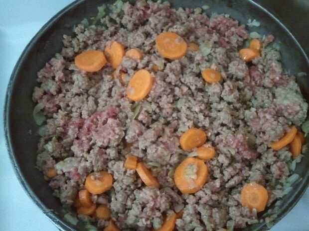 Cortar la cebolla y dorar en la sartén. Poner en la carne picada y freír hasta su todos un agradable color marrón. Cortar la zanahoria en la olla, añadir la salsa y dejar cocer a fuego lento de 20 a 30 minutos mientras la vetkoeke.