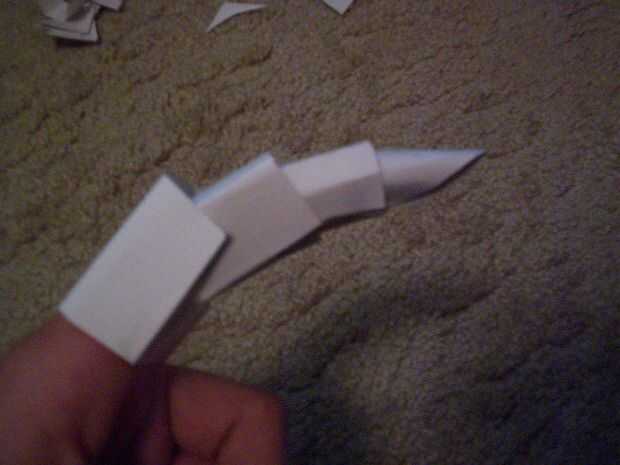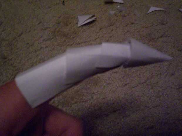 El pulgar es sólo tres piezas y es el mismo tipo de configuración, sin embargo, a diferencia de los dedos, el pulgar no necesita articular, ya que este diseño no cubre la articulación opuesta. Lo hace todo es doblez fuera del metal (o papel por ahora). Puse el anillo como partes en el pulgar de todos modos, en la base para mantenerla y en la punta del pulgar para ayudar a doblar. Hice uno en la punta para no dobla el dedo pulgar fuera de la pieza. dejando unbent y expuesto el pulgar.