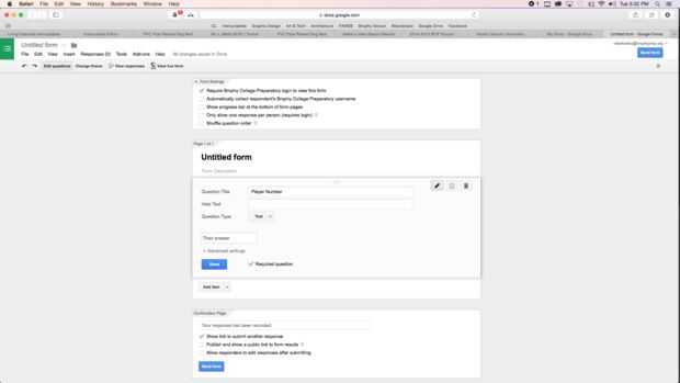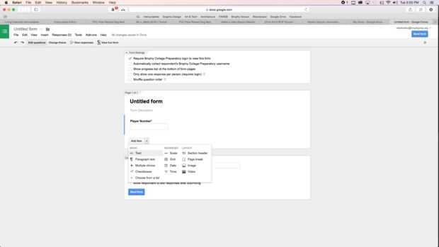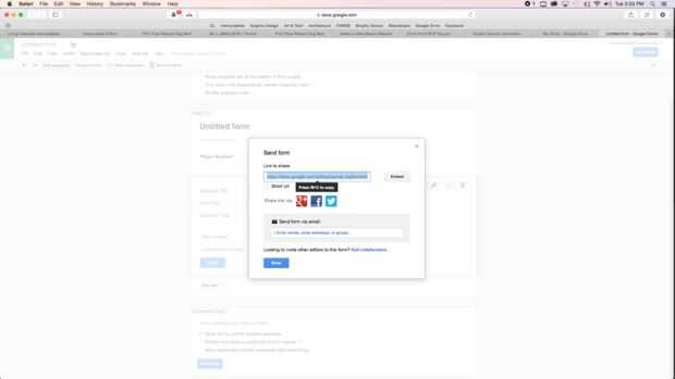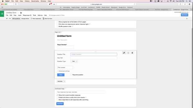 Hay muchas maneras de hacer esto, pero para mí el método más fácil es crear un formulario de Google. En la forma de recoger el número de jugadores, de jugador nombre, posición, edad o año de escuela, altura y peso. Para ello, seleccionar la opción 'Texto' para cada campo de formulario. Asegúrese de haga clic en la casilla de verificación que requiere la pregunta ser contestada. No desea que los campos en blanco. Agregar campos de número de jugadores, nombre del jugador, posición, edad o año de escuela, altura y peso. Cuando el formulario esté completo, haga clic en enviar y luego copiar el enlace en el cuadro emergente. Enviar el enlace a tus jugadores por lo que puede acceder al formulario.
