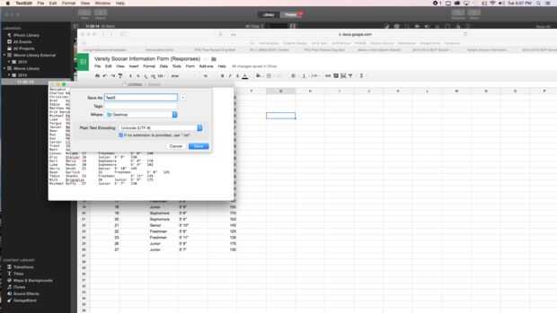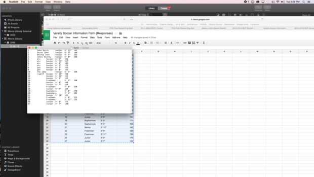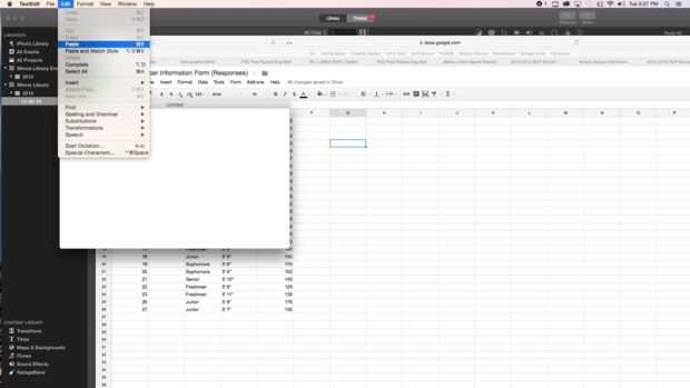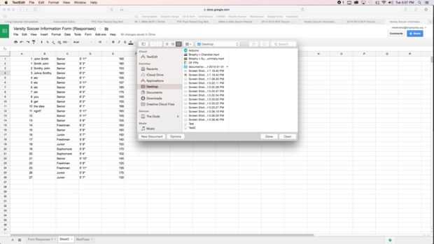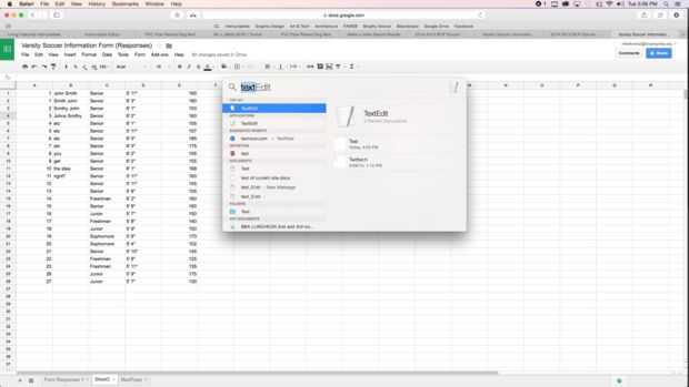 Después cada jugador llena el formulario, la información es recopilada en una hoja de cálculo de Google. Abra la hoja de cálculo, tendrá el mismo título que el formulario con la palabra 'Respuestas' añadidas y Seleccione/resalte todos los cuadros de texto. Mientras que las cajas se destacan, utilice comando C copiar la información. A continuación, en abierto TextEdit, seleccione nuevo documento y usar comando V para pegar la información en el documento. Guardar el documento en su computadora.