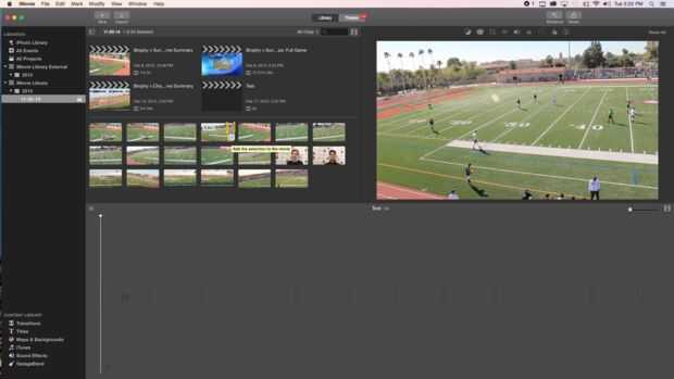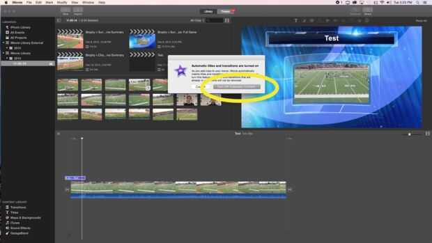 Ahora puede empezar a arrastrar imágenes a su película. Puede seleccionar parte de clip lo destacando y haciendo clic en el signo '+' para caer en el editor. El primer clip que cae en el editor automáticamente se enfrentará a algunos contenidos del tema de deportes tales como transiciones y títulos. Borrar. Se le pedirá cuando intente borrarlos si quieres 'Apagar automático contenido', seleccione esa opción. Agregará su propio contenido.