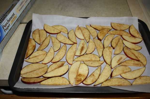 Coloque las rebanadas de manzana especiado en el papel para hornear en la bandeja para hornear.  Asegúrese de que no se solapan.