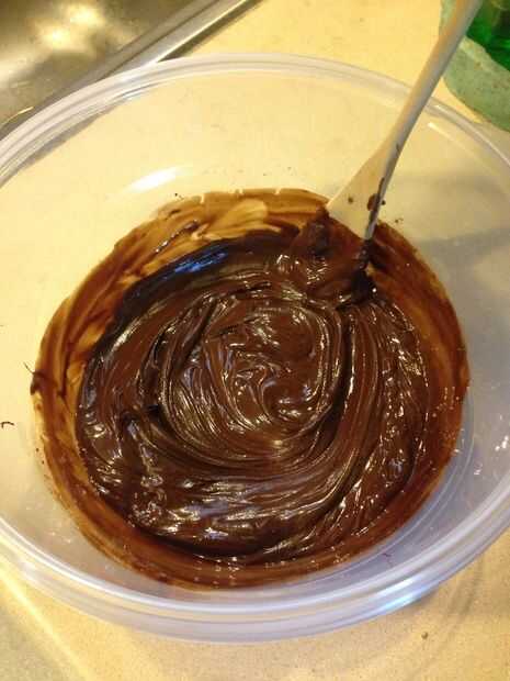 En un tazón grande para microondas, combine la mantequilla y chispas de chocolate. Microondas en alto hasta que la mezcla se derrita completamente. Sacar y revolver hasta que el chocolate y la mantequilla se mezclan totalmente juntos y la mezcla esté suave.