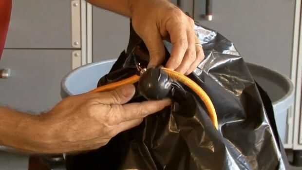 2. corte un pedazo de bolsa de basura un poco más grande que la parte superior de la papelera. Ruede para arriba la pelota de golf en medio de la bolsa y asegúrelo con un cable pequeño bunjee. Pase un cable de bungee más largo el cable más pequeño.