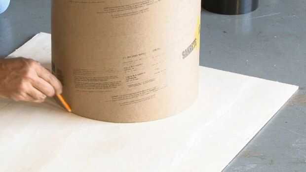 2. utilizando el tubo como guía, corte una pieza de contrachapado el diámetro de la abertura del tubo. y cinta adhesiva en la parte inferior del tubo. Luego corte un orificio de 6" en el centro de la madera contrachapada.