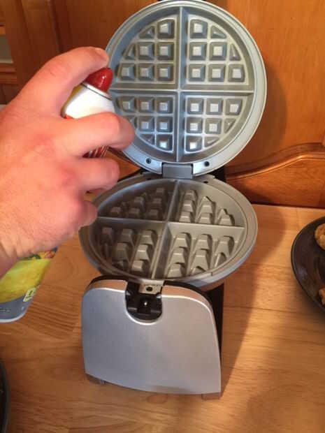 Una vez que se calienta la máquina de wafles, spray antiadherente en aerosol en ambos lados de la máquina de wafles.