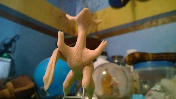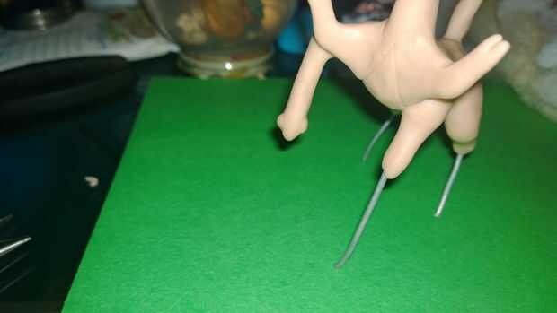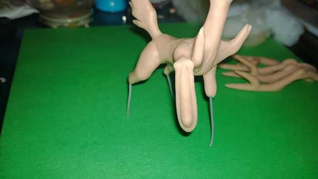 Xerneas la ya que hecho tiene una pierna hacia arriba, me decidí a terminarlo y luego cocer parcialmente el cuerpo para poder trabajar en las otras patas. Para hacer las piernas envolver lo que queda del alambre con la arcilla, después de que se han envuelto con arcilla, añadir dos bolas en la parte delantera y la parte posterior de la punta de las patas y mezclarlos en, una vez que aquellos se mezclan, ejecutar una tira fina de arcilla a lo largo de la pierna y en una pizca para que sea sostenido. Finalmente en el kness en dos bolas a los lados y pellizcar en, sólo las patas delanteras necesitan estos.