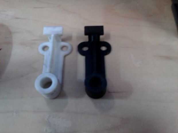 La pieza original probablemente está hecha de nylon moldeada y después de 20 años dentro de una puerta caliente se habían vuelto frágiles. El diseño original era algo fino en las áreas críticas y no tenía radio para reforzar las webs. Originalmente me había atraído la parte como diseñado y más tarde agregado grueso y radios a las áreas críticas donde se concentra el estrés. He guardado la parte como un *.stl, por lo que puede ser interpretado por la mayoría de las impresoras 3D en el mercado. El TechShop Chandler tiene tres nuevas máquinas de MakerBot 2 y tienen software privativo para maniobrar la parte para adaptarse al entorno de trabajo y el usuario. En resolución fina la parte tarda 80 minutos en el extremo inferior está a sólo 60 minutos.