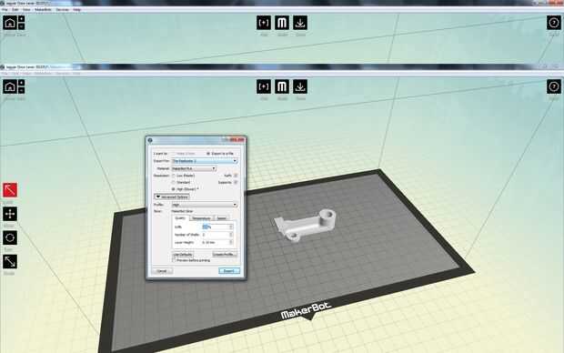 El siguiente paso es definir los parámetros para la realización real de la pieza. La primera parte "emitir" original fue fijada por 2 conchas y 10% relleno sólo para tener una idea si la parte es lo que quiero. La parte final debe hacerse con 1 cáscara y relleno de 100%. Más de 1 cáscara realmente crea una separación entre cáscaras y el relleno y en este caso que no es deseable ya que toda la fuerza posible para esta parte. Soportes y balsas también se agregan y se revisa la resolución fina. Activando la vista previa puede obtener una estimación de cuánto se tarda para que la parte a. Esta parte tenía 147 capas y 80 minutos. Haga clic en exportar y después de un breve cálculo el archivo está listo para la tarjeta SD que va en el Makerbot.