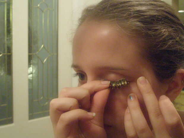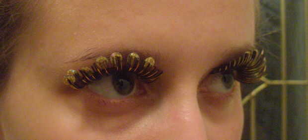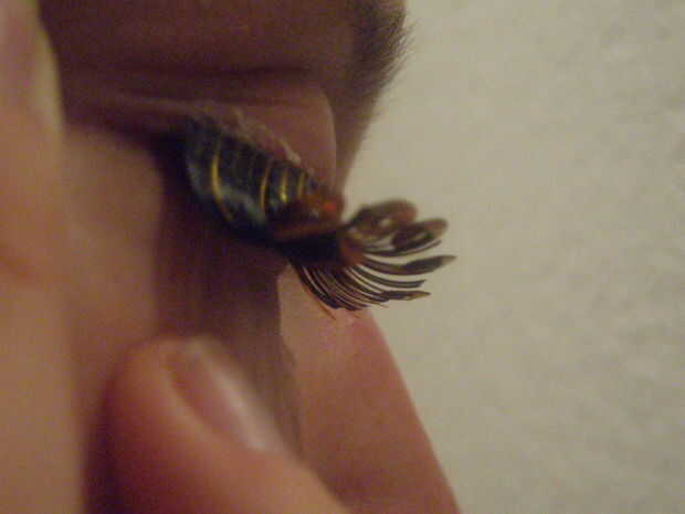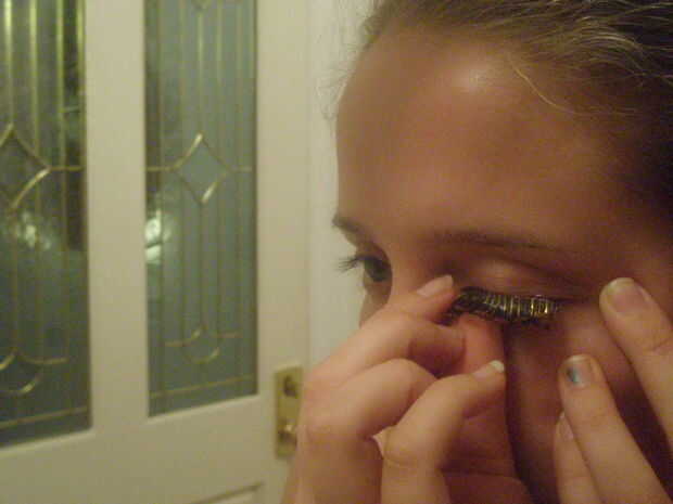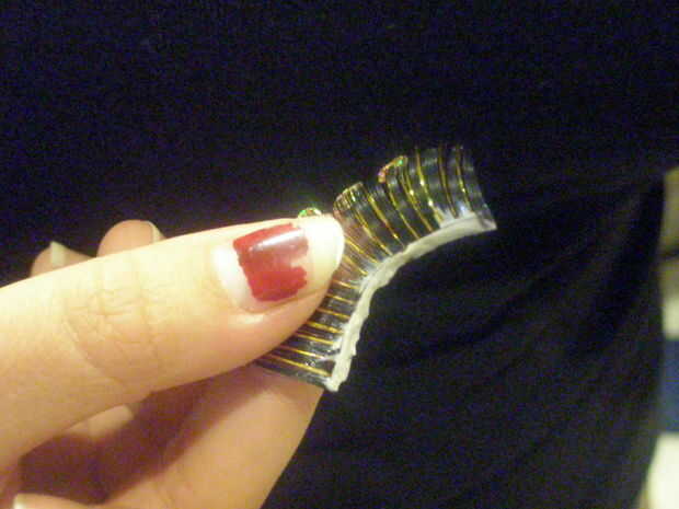 Ahora llegar a los usa! Después de aplicar cualquier otro maquillaje que vas a usar, exprimir un pegamento de pestañas poco en el dorso de la mano y una capa ligera del borde de las pestañas con ella por aferrarse a las pestañas y untar suavemente el borde en ella. (Disculpa mi esmalte de uñas de saltar!) Una vez que tengas una fina capa a lo largo de la orilla, que el pegamento seque durante al menos 30 segundos. Entonces, comenzando en la esquina interna del ojo, pega el extremo de las pestañas como cerca de su línea natural lash como sea posible. A veces pinzas pueden ser útiles para este paso también. Una vez que el ángulo interno seguro, aplique lentamente el resto de las pestañas, está tan cerca de tu línea del latigazo como sea posible. Aplique presión con los dedos durante unos segundos antes de soltar el párpado para que las pestañas son totalmente seguras. Retocar cualquier maquillaje que puede haber frotado durante la aplicación de pestañas y eres bueno para ir!