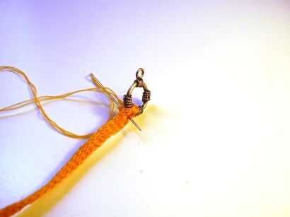 Ahora introduzca un extremo de la pieza más larga de la cinta en el anillo más pequeño de las pulseras. La superficie de la cinta debe tocar el interior del anillo.