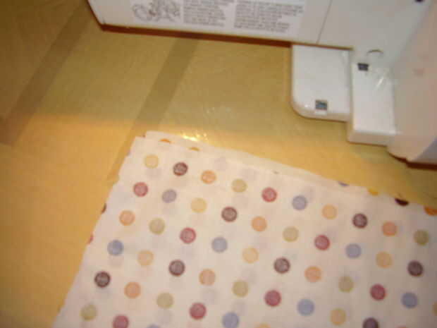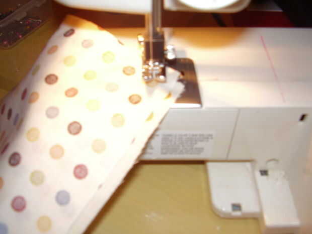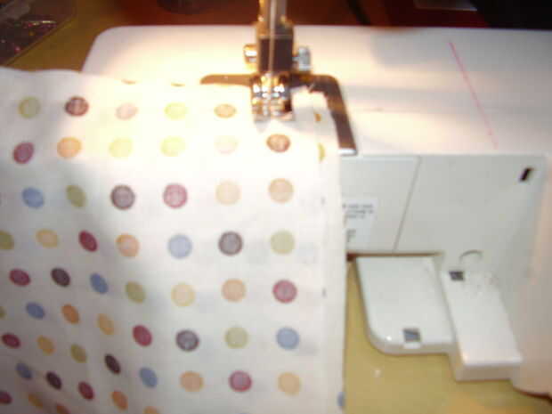 Comenzando en la parte superior, utilizando una puntada recta, cose por el lado de la bolsa, dejando de margen de costura de 3/8 a 1/2 pulgada. Al llegar a la parte inferior de la bolsa, coser a 1/2 pulgada desde el borde inferior y con la aguja hacia abajo en el tejido, levante el prensatelas de la máquina y gire a la tela 90 grados. Ahora coser el borde inferior de la bolsa. Asegúrese de hacer unas puntadas hacia atrás al principio y al final de esta costura para evitar el colapso.