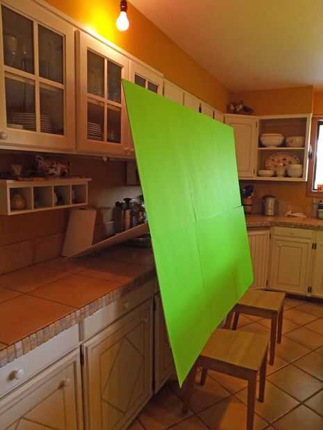 En tercer lugar, junte todos los paneles de 6 (o más) en una superficie plana lateral-de respaldo y pegamento tiras de cinta velcro en un patrón que se unirá todos los paneles en una gran pantalla verde. Cortar el lado del gancho y cinta del lazo que se pega a los paneles que se puede tomar aparte y apiladas. Pegue el lado opuesto de la cinta de gancho y bucle para algo tieso, como espuma o listones de madera ligeros. Estas servirán de punto elástico para la pantalla verde montada (ver imágenes).