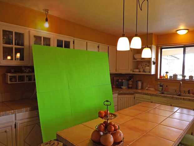 El mayor inconveniente que tuve en el uso de la pantalla de mi verde era que no tenía suficiente espacio para reposar los pies 10 ideal delante de la pantalla. Debido a la isla de la cocina, la distancia más que podría conseguir entre la pantalla y yo era cuatro pies. A esa distancia, piel y texturas difusas (como mi cabello) recogerá el verde de la pantalla y le terminan con un halo verde alrededor del tema en el final especial efectos de edición (véase la parte final del vídeo en el paso 1). Un montón de iluminación sobre el tema puede ayudar, especialmente si se agrega magenta iluminación sobre el tema.