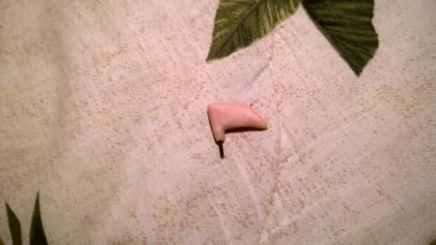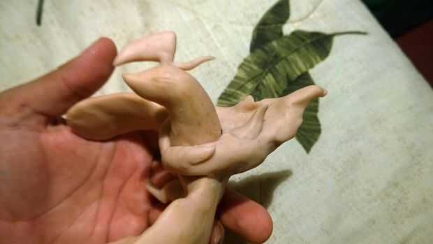 Al hacer los cuernos, entró en el problema que en la obra de arte, las partes que conectan el cuerno en la cabeza son muy finas así que corte un trozo pequeño de alambre para reforzar. Una vez que está hecho, simplemente pegué el cuerno en la cabeza. Una vez hecho esto, añadir una pequeña pieza de barro detrás de la bocina como en la foto.