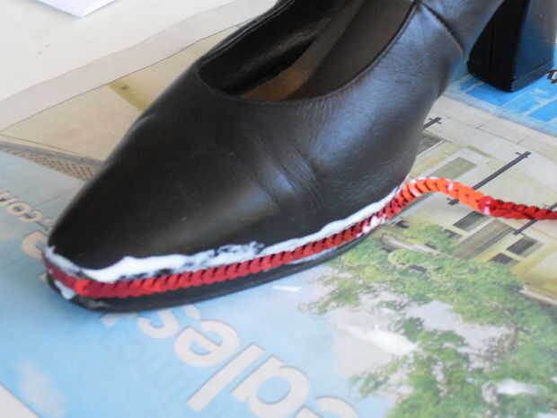 Paso 1: Iniciar en la parte inferior de la zapata y poner una línea de pegamento PVA alrededor de la parte inferior. Colocar las lentejuelas en la cola y vaya alrededor de la zapata hasta yo llegar a la cima. Asegúrese de seguir mirando hacia atrás en lo que ya has hecho porque no quieren los huecos. Usted tendrá que seguir presionando las lentejuelas y esto puede conseguir desordenado.