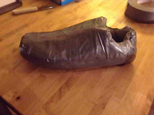Empezar a envolver el zapato en cinta adhesiva, asegurándose de que hay mínimas arrugas en la cinta.  Poner un mínimo de 10 capas en el zapato entero y por lo menos 15 capas en la parte inferior, para un apoyo extra.