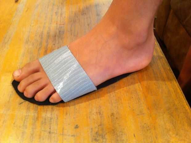 Corte una tira de pato cinta (esto dependerá de la anchura del pie, mi pie me sobre 7" pieza) y envolver un pedazo de lado pegajoso de la cinta pato alrededor de la parte superior del pie justo por debajo de los dedos. La cinta del pato se pega a la parte superior del neopreno bajo su pie.