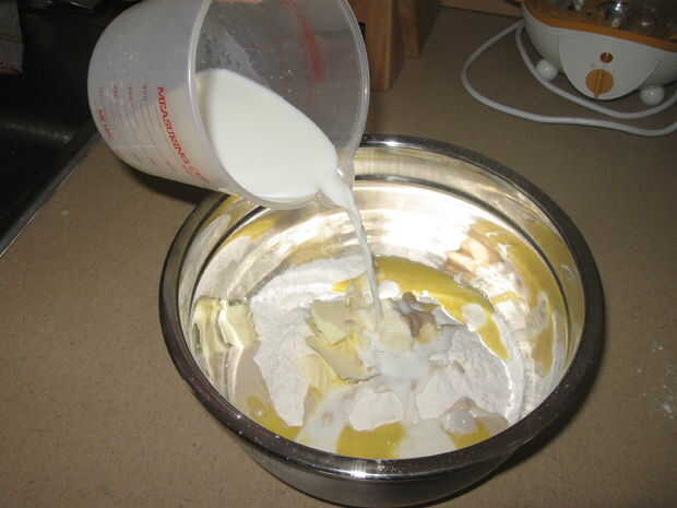 poner la harina, leche, sal, huevo, mantequilla y levadura en el tazón de fuente