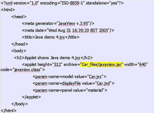 La línea que presenta javaview.jar siempre apunta automáticamente a la carpeta de Javaview/los tarros y ahora tiene que poner a mano a punto donde guardaste los archivos de página web, "Car_files/javaview.jar" en este ejemplo, la carpeta se denomina Car_files.