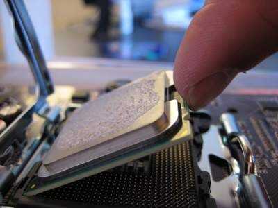 Sujetar la CPU por los bordes de las muescas. Alinee las muescas de la CPU con el zócalo de la CPU y baje el CPU, comenzando en el extremo con las muescas y soltando ligeramente el otro extremo de la CPU.