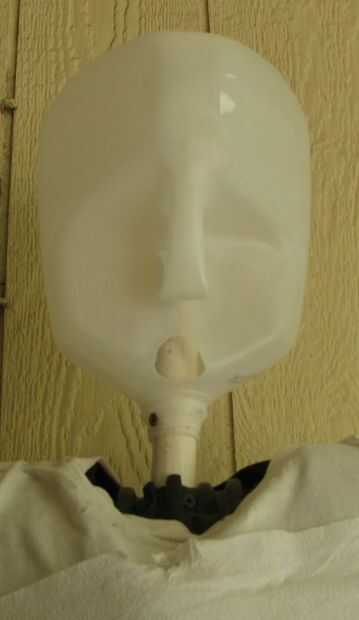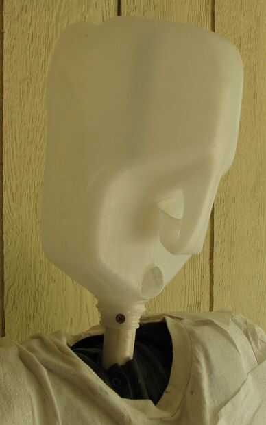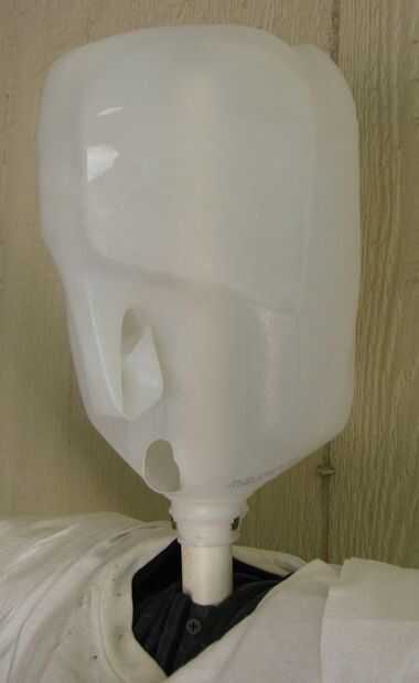 Tomar un jarro vacío de leche o agua e Inserte el tubo de pvc. Tornillo de la jarra a la tubería de pvc para mantenerlo estable. Voltear el recipiente boca abajo y mira dónde está el mango, entrecierra los ojos; tipo de parece una cabeza, ¿no? El mango será la nariz, pero usted tendrá que cortar el mango en la base y doblar bajo para dar lugar a una boca.