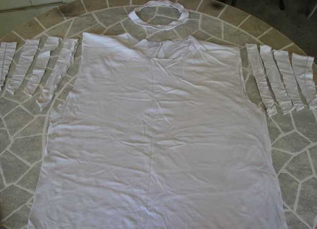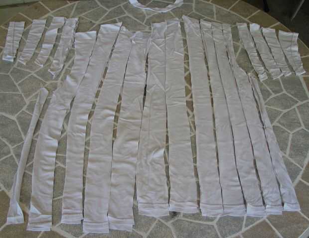 Cortar las mangas apagado y los cuellos de las camisas restantes; cortar las mangas en tiras de una pulgada a dos pulgadas. Hacer lo mismo con la camisa se. Estas tiras se utilizará para envolver las manos, brazos y cabeza y cuello de la momia.