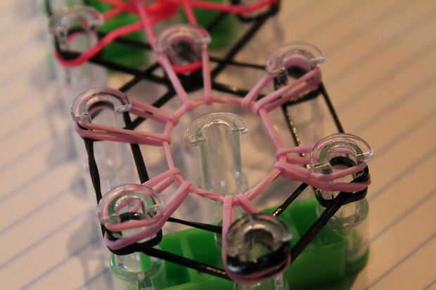 Gire el telar de manera que la clavija de la tapa es más cercana a usted y comenzar la colocación de las bandas de la parte inferior enclavijar hacia fuera en sentido contrario.
