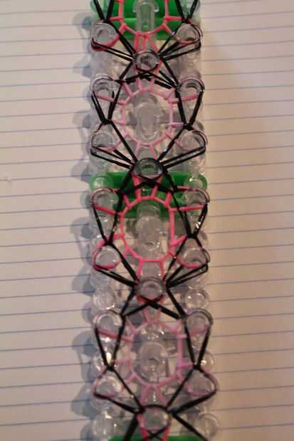 esto es una pulsera de nivel intermediaria, se puede hacer muy fácilmente.Fuentes: 3 colores de bandas en telar, telar del arco iris y un gancho.Paso 1: Empezar por colocar dos bandas blancas en forma de 'v' en el inicio del telar.Paso 2: El lugar un
