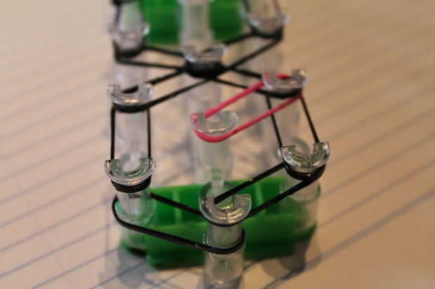 esto es una pulsera de nivel intermediaria, se puede hacer muy fácilmente.Fuentes: 3 colores de bandas en telar, telar del arco iris y un gancho.Paso 1: Empezar por colocar dos bandas blancas en forma de 'v' en el inicio del telar.Paso 2: El lugar un