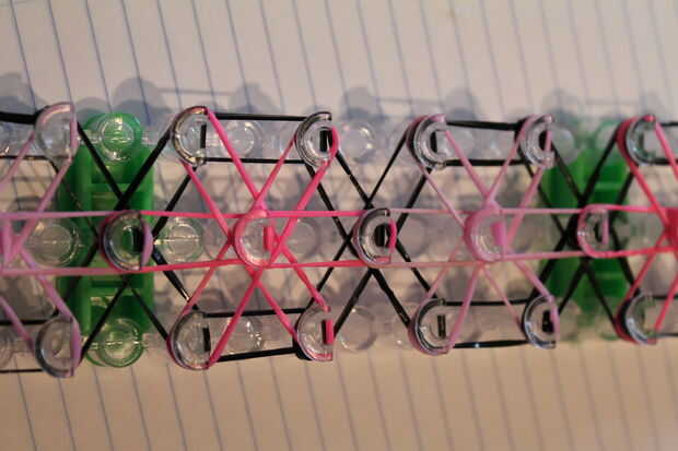 esto es una pulsera de nivel intermediaria, se puede hacer muy fácilmente.Fuentes: 3 colores de bandas en telar, telar del arco iris y un gancho.Paso 1: Empezar por colocar dos bandas blancas en forma de 'v' en el inicio del telar.Paso 2: El lugar un