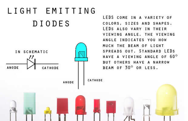 El diodo semiconductor se encajona en un lente de plástico sólido. A veces el plástico es de color, y puedes encontrar LEDs en casi cada color. Aparte de la corriente nominal en su LED, el tamaño y la forma del recinto plástico determinarán cómo y cuánto, luz del LED es capaz de lanzar.