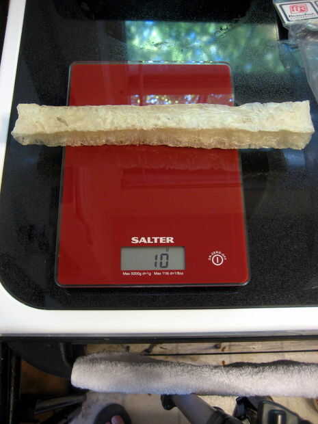 El agar que compré fue en palos de 10 pulgadas que pesaron unos 10 gramos, así que simplemente aserrado de media pulgada.