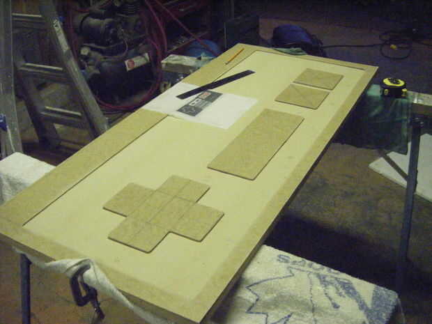 Entonces tomó la 1/8 en MDF y cortar las partes levantadas del controlador de nintendo. Me basé en mis planos y un cálculo aproximado para obtener los espacios entre la colocación del MDF de 1/8
