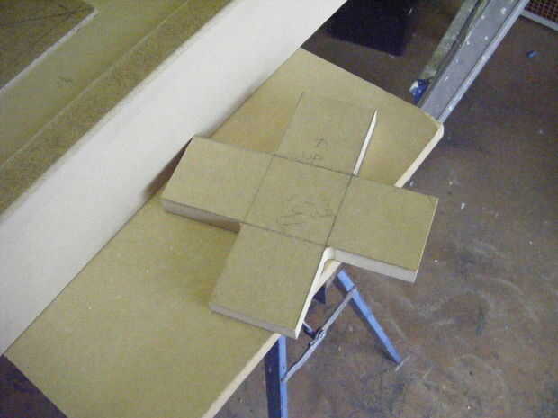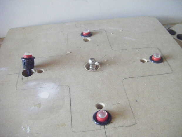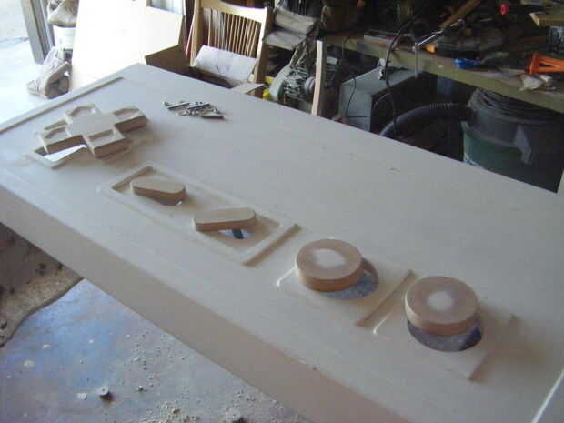 El d-pad fue cortado de 3/4 en MDF y las flechas fueron cortadas del MDF de 1/8 y luego les pegan y enruta los bordes.