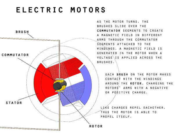 Un motor eléctrico utiliza la atracción y rechazo las propiedades de los imanes para crear movimiento. En un motor eléctrico estándar hay dos imanes: un imán permanente y un imán temporal. El imán temporal es un tipo especial de imán, llamado un electroimán. Un electroimán se crea al pasar una corriente eléctrica a través de un cable. El imán permanente tiene un campo magnético (un polo norte y un polo sur) todo el tiempo, pero el electroimán sólo tiene un campo magnético cuando hay una corriente que fluye a través del cable. La fuerza del campo de magnético electromagnético del cable puede intensificarse por aumento de la corriente a través del cable, o formando el cable en bucles múltiples.