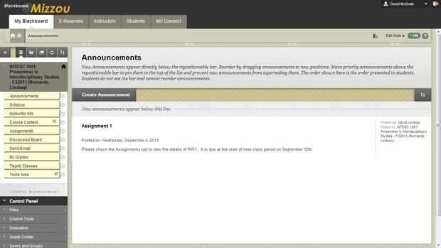 Esta es la primera página de sus estudiantes a ver cuando inicie sesión en Blackboard y ver la página de la clase de higo. Por defecto, también sirve como la página del anuncio. Cualquier anuncios que crear aparecerán en esta página para la comodidad de sus estudiantes.