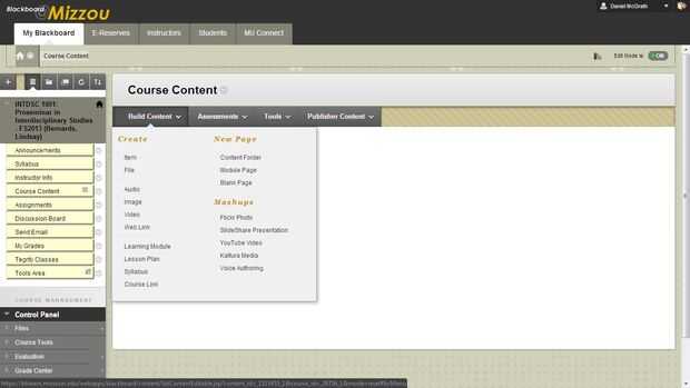 Haciendo clic en el botón curso contenidos en la lista izquierda se trajo a la página de contenido de curso. Este es un buen lugar para publicar cualquier cosa que no encaja como un anuncio o una asignación. Muchos profesores publicar sus notas de clase, enlaces web y otros archivos útiles en esta página. Usted puede usar esto para publicar enlaces a sitios web mencionado en clase como herramientas útiles o publicar sus presentaciones los estudiantes que puede devolver a ellos después de clase. Construcción de contenidos es muy similar a la página de plan de estudios, pero tus posts será probablemente "Items" en el botón de generar contenido. La diferencia entre elementos y archivos es que elementos tienen los datos de texto asociados con el post junto con la opción de archivo adjunto. Si simplemente desea enviar un archivo sin información circundante, crear un archivo es su mejor apuesta. Crear un elemento en el contenido de curso da sección que espacio para crear un nombre, el texto que servirá como descripción para el mensaje, archivo adjunto y las opciones de tiempo familiar.