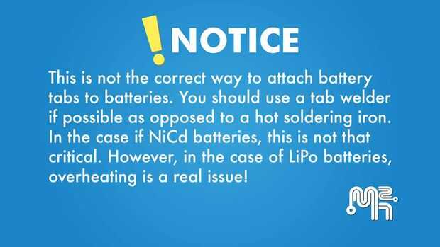 TENGA EN CUENTA. No es la forma correcta de colocar las pestañas de la batería a pilas. Debe utilizar un soldador de pestaña si es posible en comparación con un soldador caliente. En el caso de las baterías de NiCd, esto no es lo que crítica. Sin embargo, en el caso de baterías de LiPo, sobrecalentamiento es un problema real.
